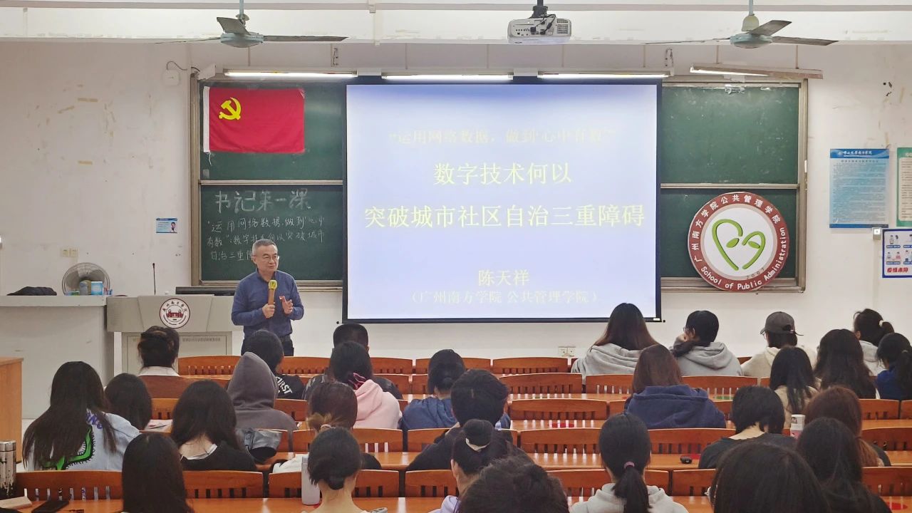 首先,陈天祥院长为同学们介绍了城市社区自治面临的三大障碍,包括社区居委会的行政化、社区原子化、社区自治边缘化,使同学们对这些问题有了清晰的认识。其次,陈天祥院长列举了改革开放、社区自治等例子,并结合自身经验,深入分析“三重障碍”对社会的多重影响,并且表达了希望社区自治能够取得进步和发展的愿望。最后,陈天祥院长从数字技术发展的角度出发,提出了数字减负,利用数字技术激活人际互动,从而提高社区自治,推动社区的发展。