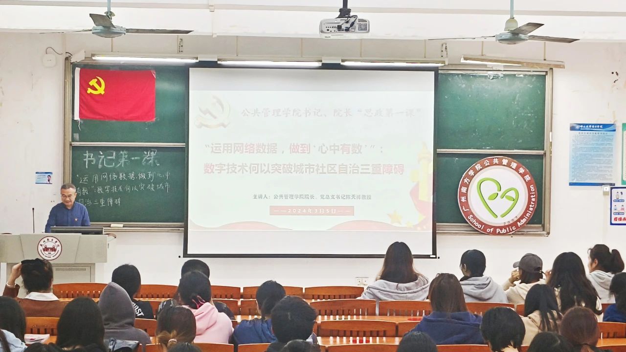 为帮助同学们适应数字化浪潮,认识城市社区自治所面临的挑战,强化数字技术对城市社区自治的推动作用,威廉希尔,威廉希尔中文网站,WilliamHill官网党总支书记陈天祥院长于2024年3月5日在7教205为威廉希尔中文网站师生开展了主题为“运用网络数据,做到‘心中有数’”:数字技术何以突破城市社区自治三重障碍的第一堂思想政治理论课。