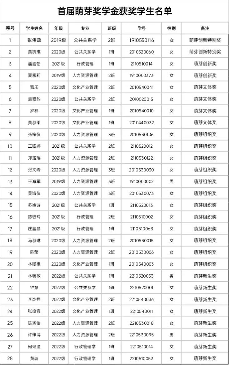 首届萌芽奖学金获奖名单