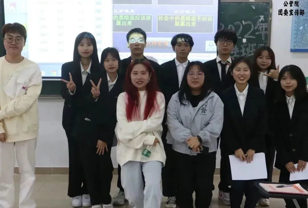 本场辩论赛的辩题是“社会中的黑暗面应不应该展露出来?”。来自行管2班的正方“舌战群儒”队认为“社会中的黑暗面应该展露出来”,而来自行管1班的反方“你说的都”队持“社会中的黑暗面不应该展露出来”的观点。