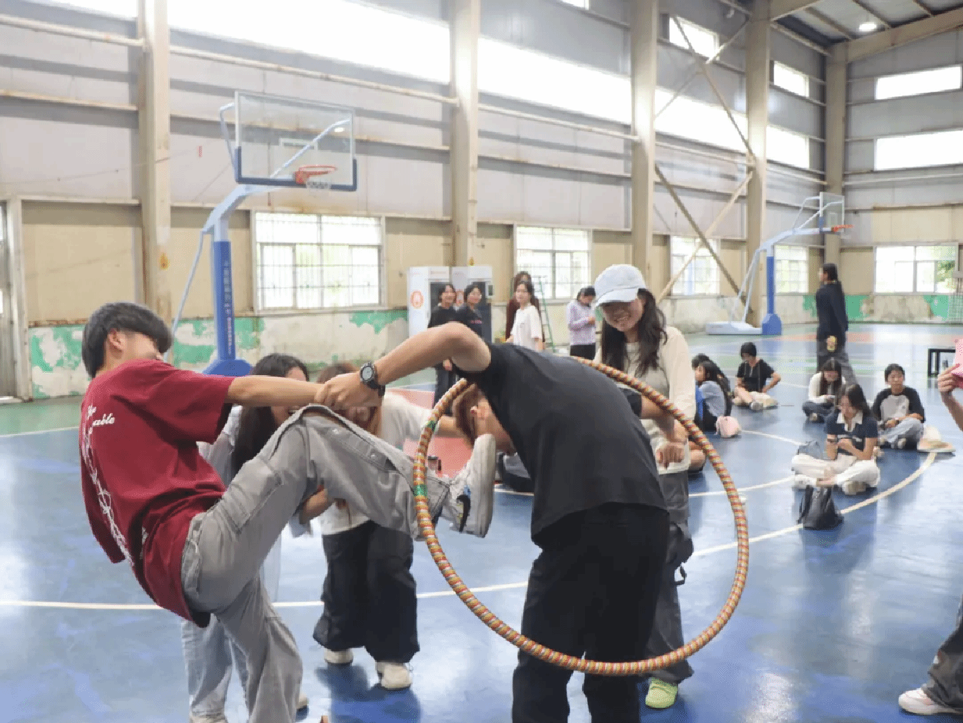 工作人员按照花名册随机点名,每班5位同学手拉手围成一圈,用呼啦圈穿过所有人的身体回到原位。在活动过程中,参与者必须保持相互拉着的手不放开,并且不允许用手指去勾呼啦圈。最后根据每班用时长短进行排名。