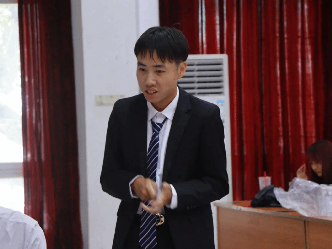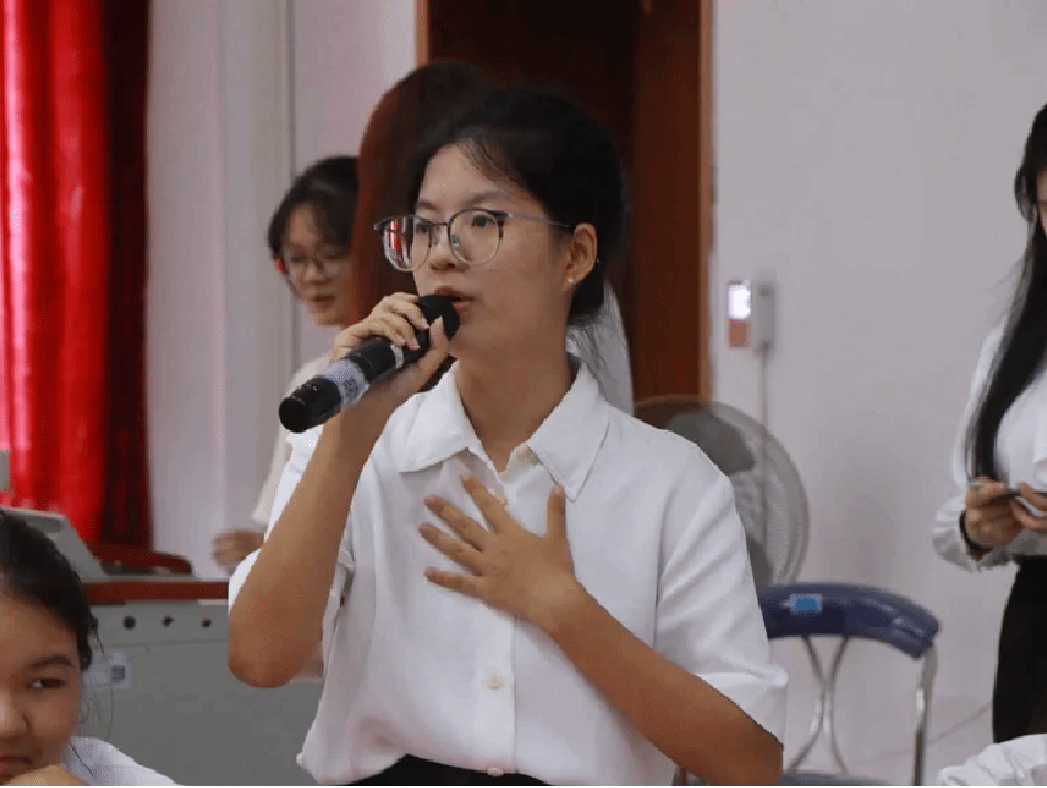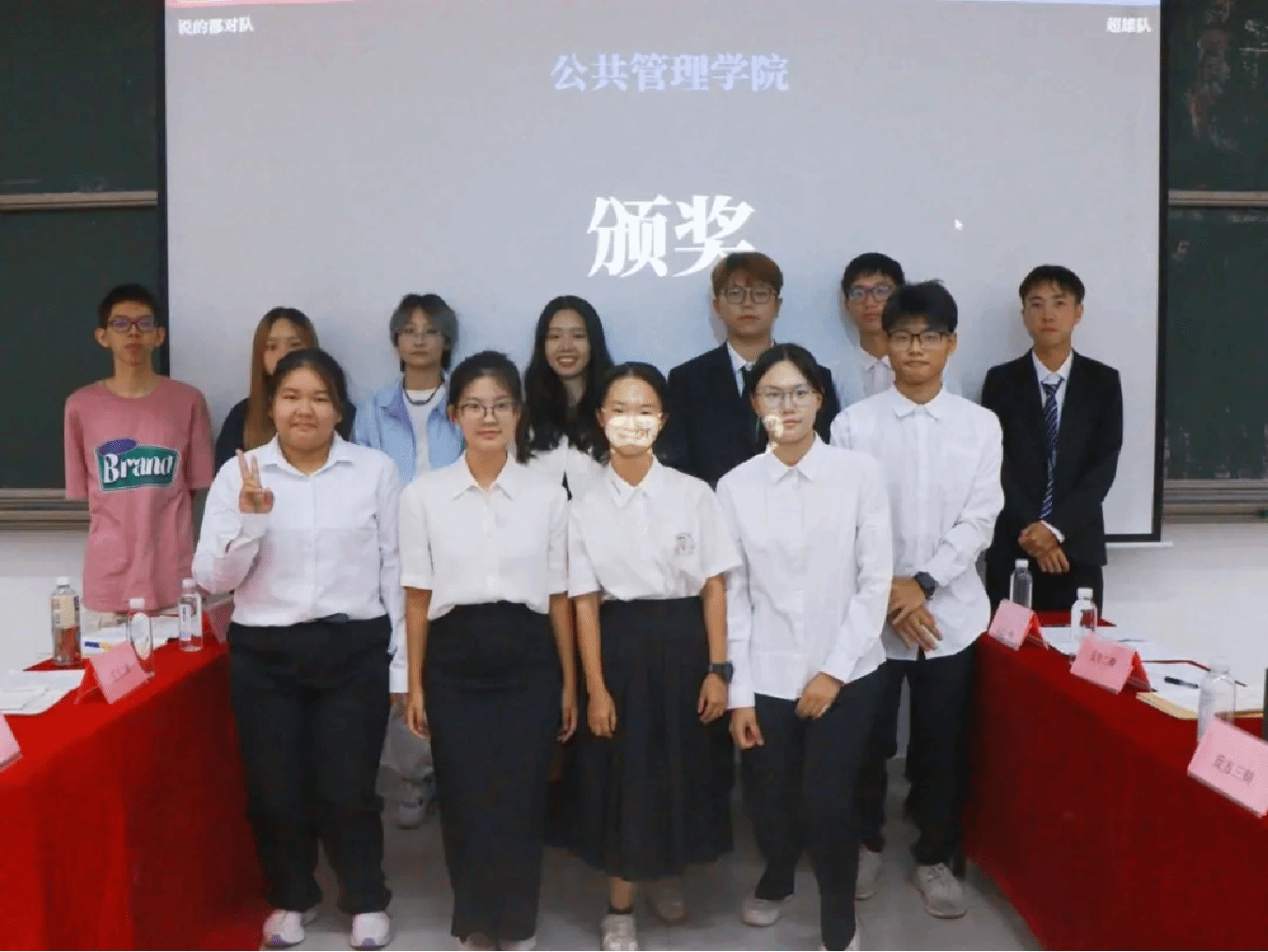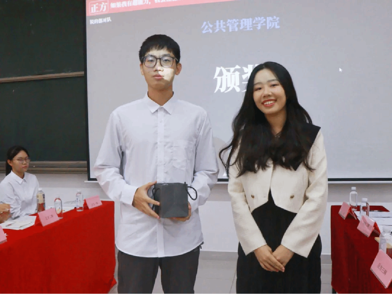 最终经由观众投票选出,本次辩论赛的最佳辩手为反方三辩辩手周正,嘉宾梁颖姿辅导员为最佳辩手送上礼品并合影留念。