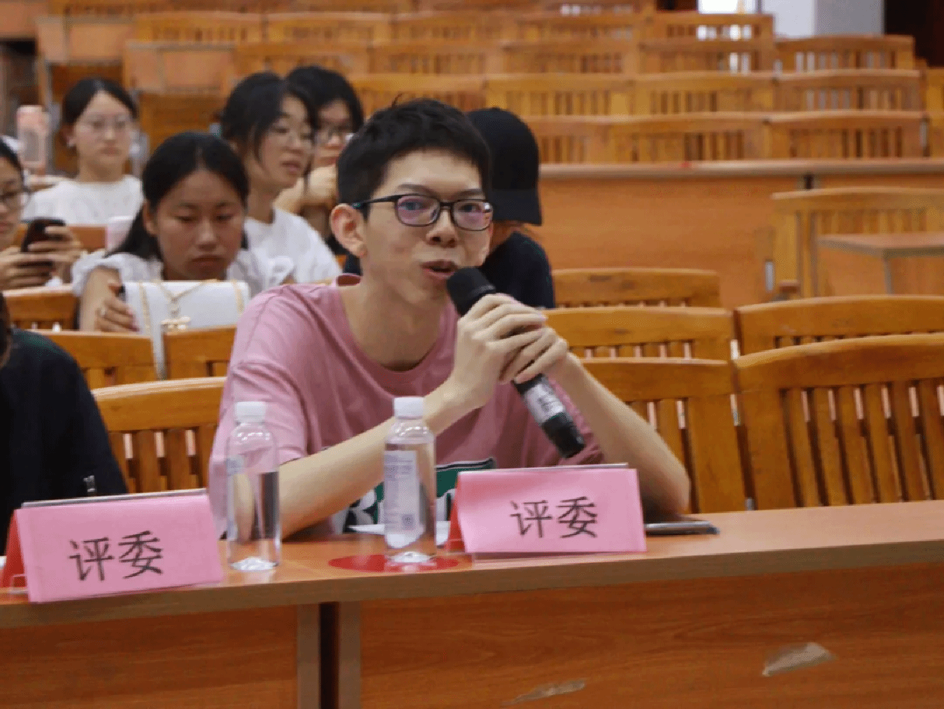 表演赛结束,吴嘉鑫评委对双方的精彩辩论作总结,提出在双方辩论中存在的疑问,邀请双方辩手作出回应探讨问题,最后给予一定的鼓励和意见。