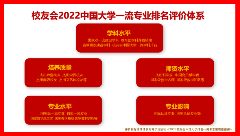 自2015年起,艾瑞深校友会网已经连续8年发布校友会中国大学一流专业排名,已成为中国参评高校数量最多和参评专业规模最大的中国大学本科专业排名。校友会2022年中国大学一流专业排名评价指标由学科水平、培养质量、师资水平、专业水平和专业影响五大指标构成,涵盖了国家“双一流”建设学科、教育部学科评估结果、国家级一流本科专业建设点、杰出校友、杰出师资等100多项评价观测指标。