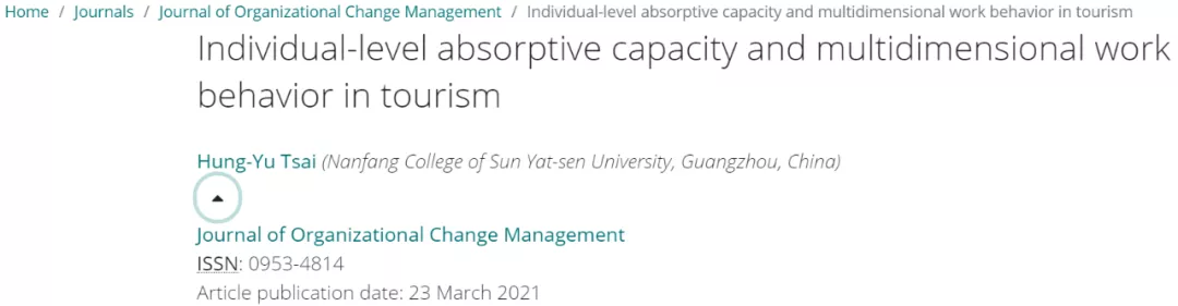 2021年3月,中山大学南方学院威廉希尔中文网站蔡泓育老师的论文《Individual-level absorptive capacity and multidimensional work behavior in tourism》以独立作者发表在国际期刊《Journal of Organizational Change Management》。《Journal of Organizational Change Management》是社会科学引文索引(Social Science Citation Index, SSCI)收录期刊,根据JCR报告,2019年的影响因子为0.967。