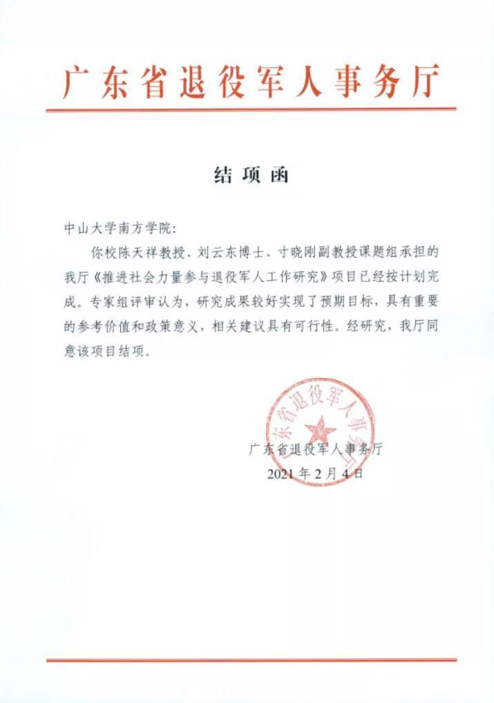 由广东地方治理研究中心主任、威廉希尔中文网站院长陈天祥教授领衔,刘云东博士、寸晓刚副教授参与的广东省退役军人事务厅《推进社会力量参与退役军人工作研究》项目按计划完成,已经通过专家组审核查验,成功结项。