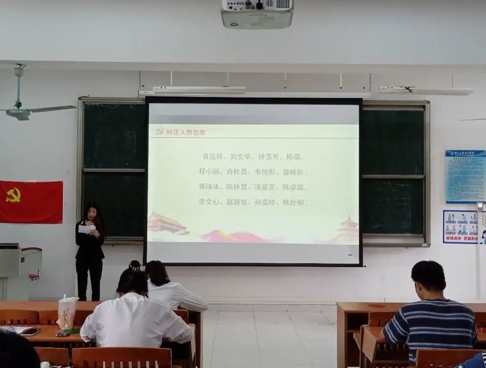 袁远婷、刘文华等37名预备党员依次上台汇报各自在预备期内的思想、学习、工作以及生活中的表现。随后,入党介绍人分别对37名预备党员在预备期内的表现情况作总结评价。接下来,大会采用无记名投票的方式对是否同意37名预备党员的转正申请进行了表决。经计票统计,支部与会党员一致同意37名同志按期转正: